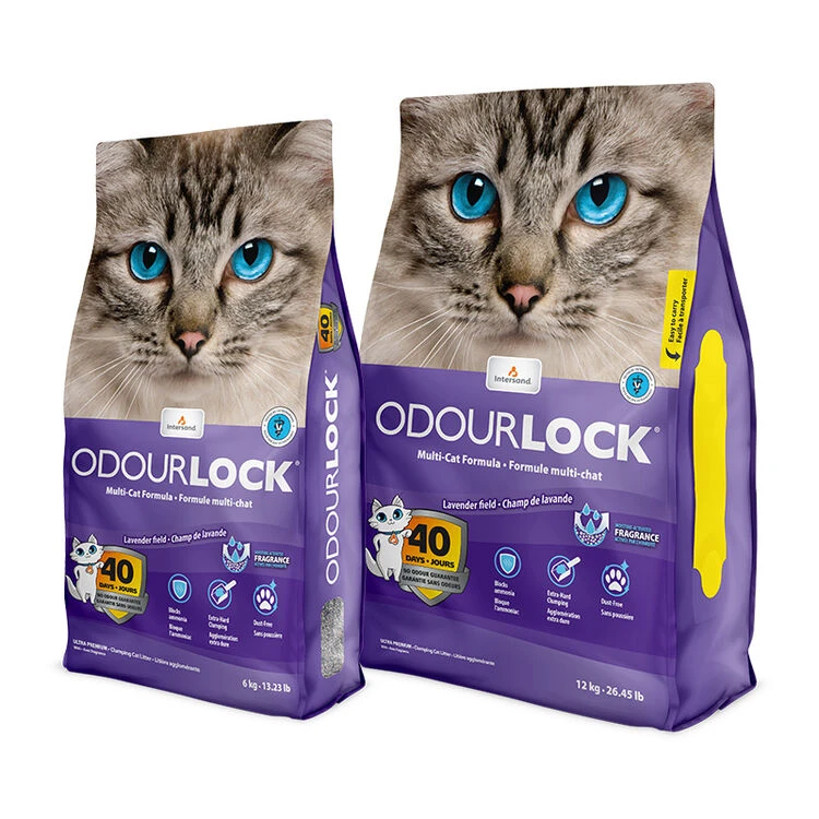 This clumping cat litter is made from all-natural clay. Its patented “Smart Odour Shield” technology blocks ammonia release, uniquely neutralising urine and faeces odours for 40 days. This ultra-fast clumping and easy scooping litter makes litter box cleaning so effortless. OdourLock generates less waste than competing clay litters: you’ll use 45% less litter per year. Plus, it’s 99.9% dust-free, leaving no tracking on floors or furniture and keeping your cat’s and your family’s respiratory systems safe. It is soft and comfortable for your cat. It is easily carried thanks to its side handle and is manufactured in Quebec.